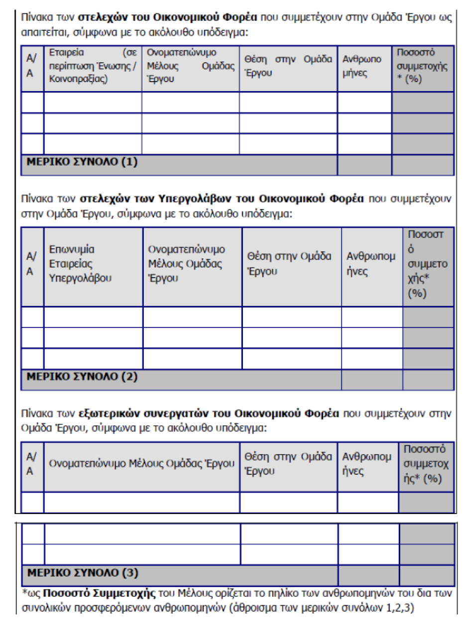 Διευκρινίζεται ότι δεν απαιτείται συμπλήρωση στον πίνακα της παρ. 2.2.9.2 (Β4) περ. Β.4.1 των στηλών «Ανθρωπομήνες» και «Ποσοστό συμμετοχής %», καθώς η οριστική ανθρωποπροσπάθεια των στελεχών της Ομάδας Έργου θα δηλώνεται σε κάθε εκτελεστική σύμβαση. Οι εν λόγω στήλες αναφέρονται εκ παραδρομής και δεν θα πρέπει να ληφθούν υπόψη από τους υποψηφίους συμμετέχοντες.